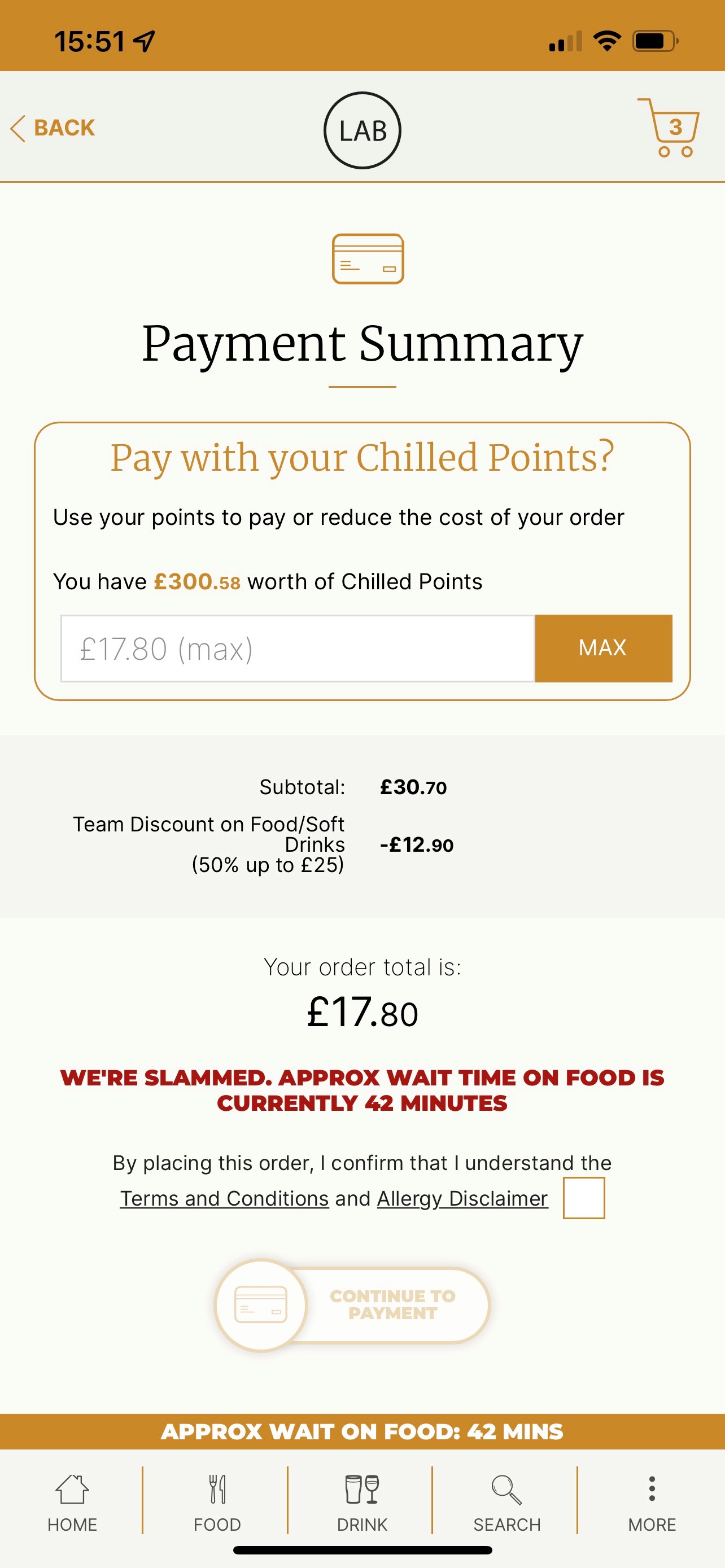 Any points earned during this visit will automatically be assigned once payment is made as long as you are logged into your chilled pubs app. If you were not logged in you can claim your points using the redeem code on your email receipt!