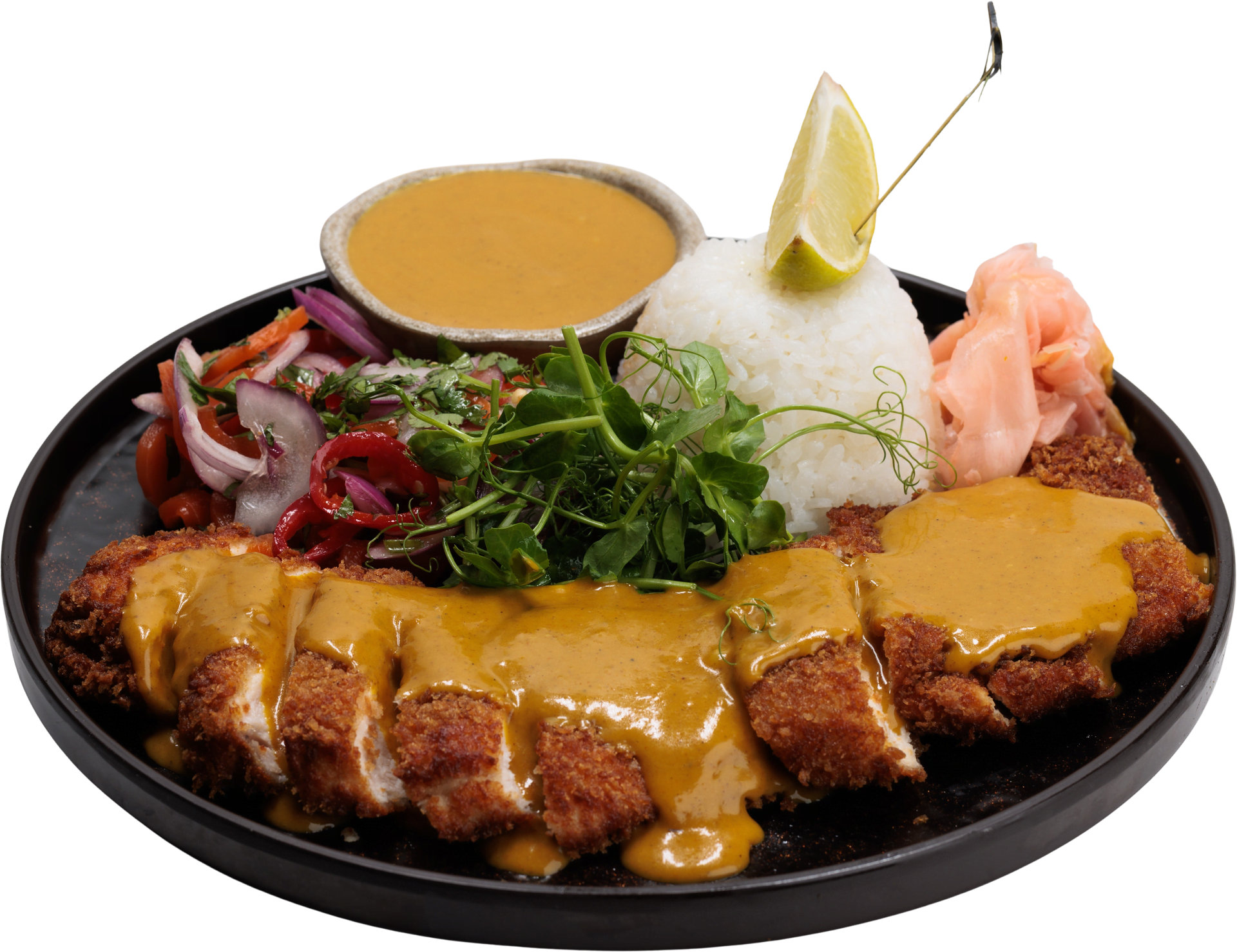 Panko crumbed chicken breast + Home-made Katsu chicken sauce + Basmati rice + pickled salad carrot, coriander and red onion + red... Read more