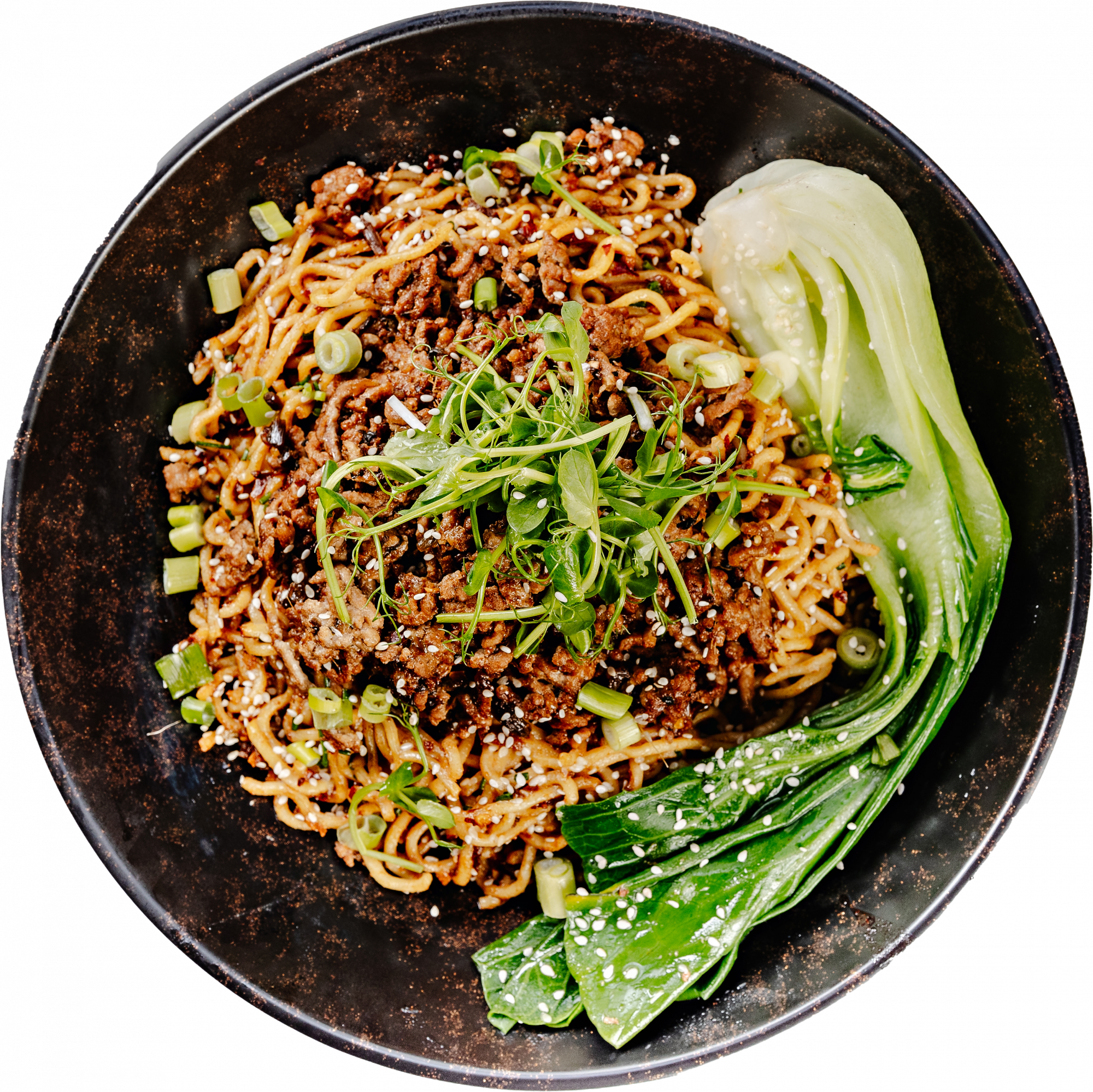 Pork mince + Adobo style sauce + soba noodles + Pak Choi + spring onion + sesame seeds + Sichuan Chilli oil