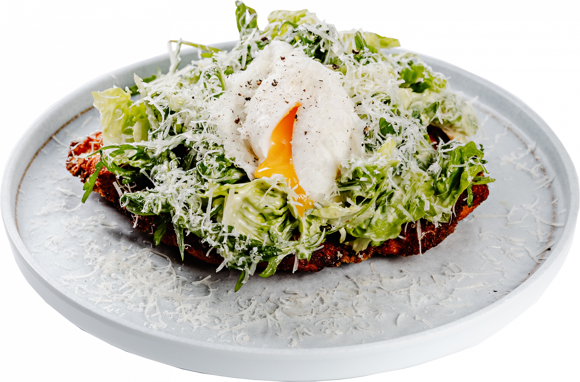 Panko crumbed chicken breast + baby gem + rocket + avocado + parmesan cheese + Dijon mayo dressing + poached egg