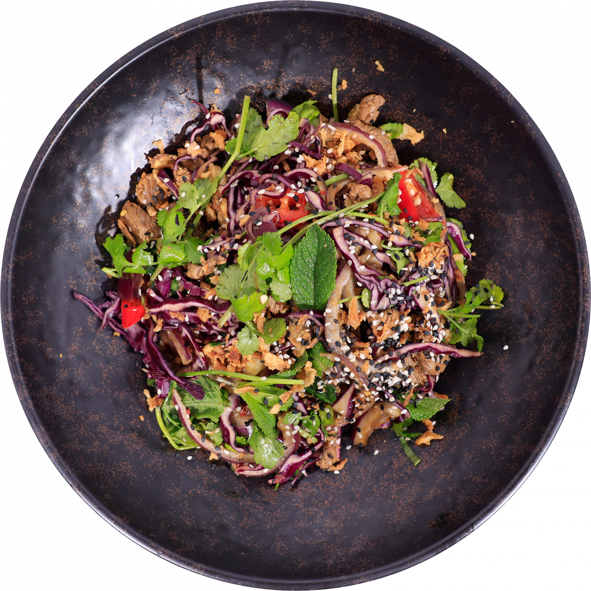 Marinated fillet steak + red cabbage + red onion + fresh red chilli + coriander + mint + crispy onions + spring onion + Thai style... Read more