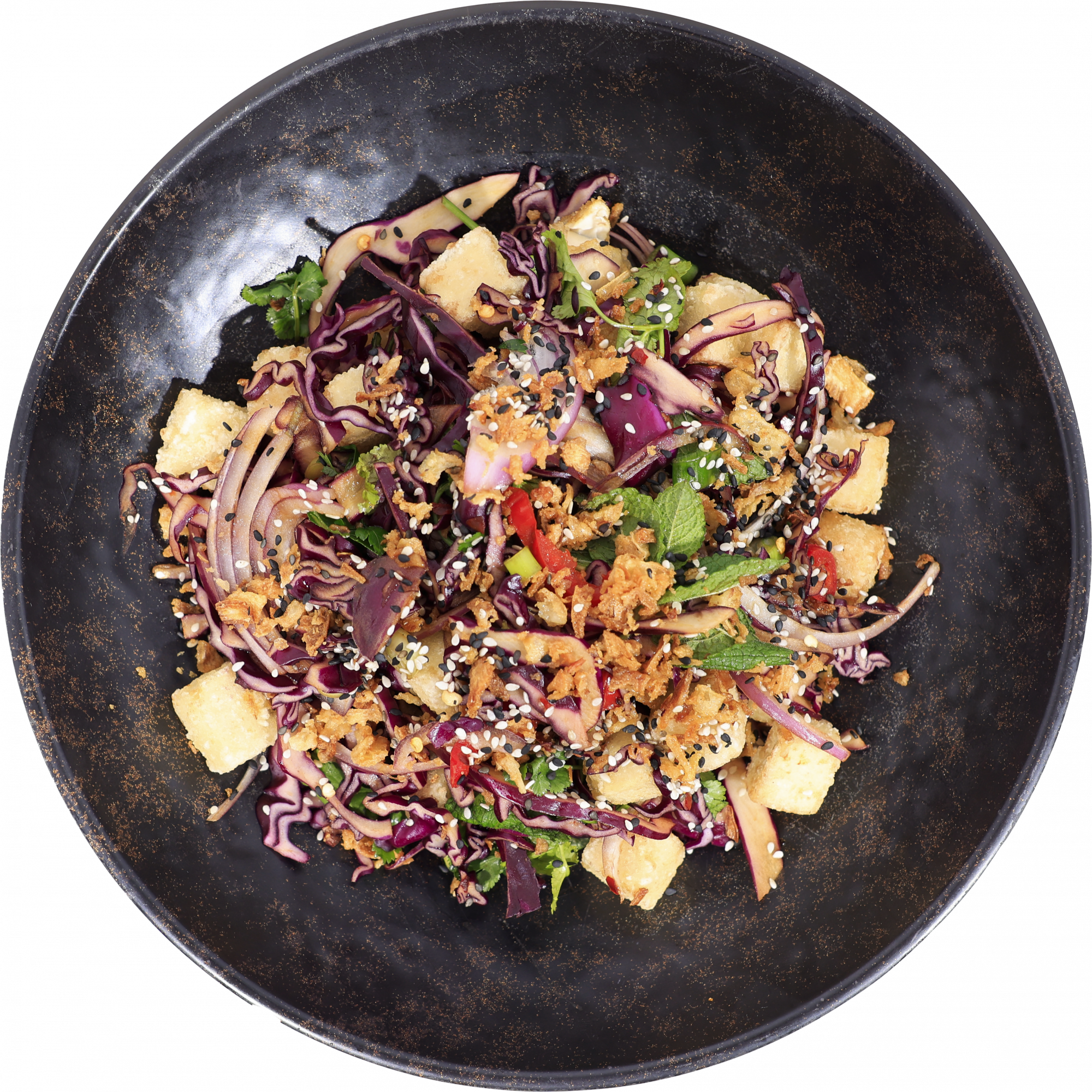 Crispy fried tofu + red cabbage + red onion + fresh red chilli + coriander + mint + crispy onions + spring onion + Thai style dres... Read more