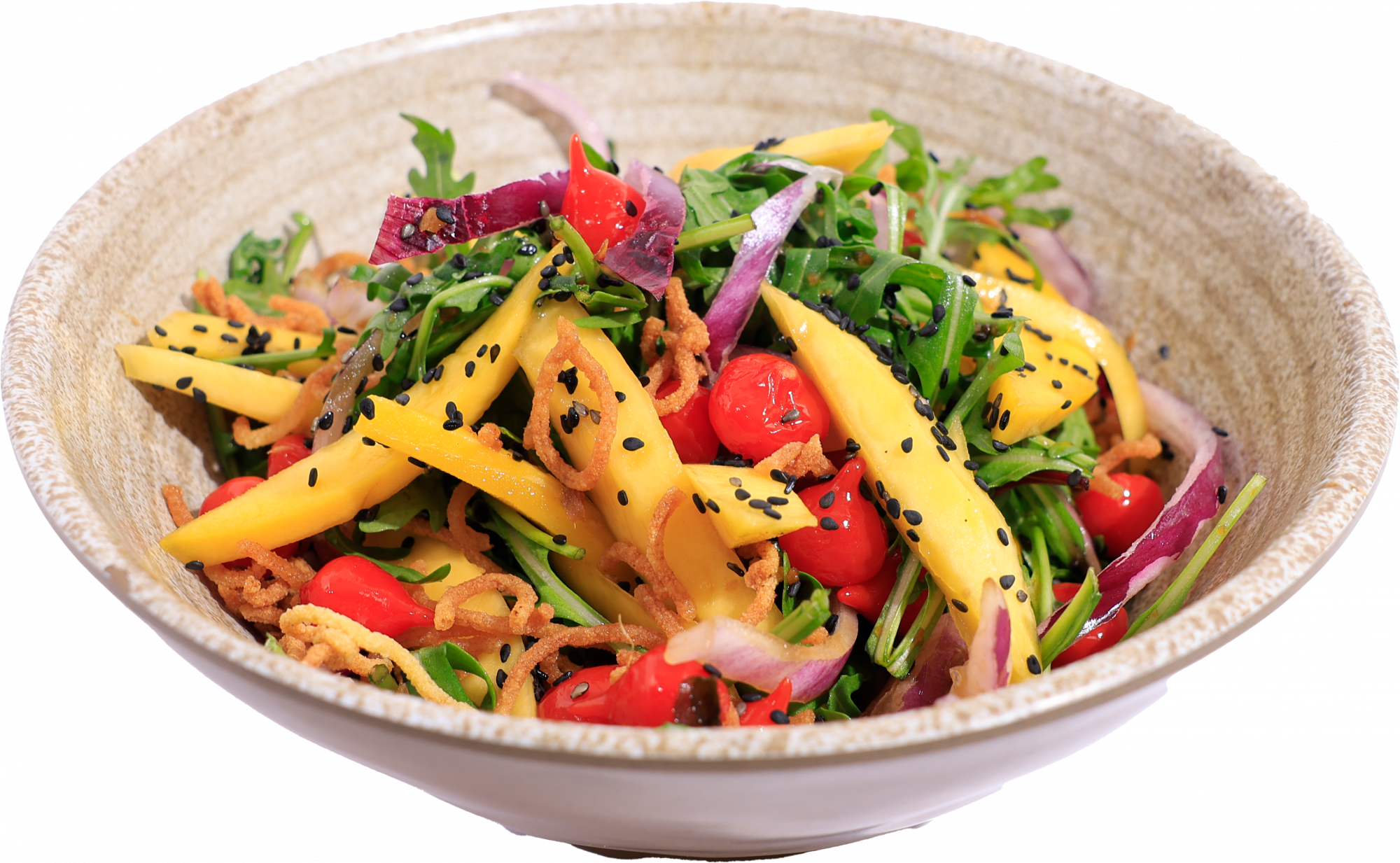 Mango slices + roquito peppers + red onion + black onion seeds + crunchy fried soba noodles + rocket + Thai mango salad dressing