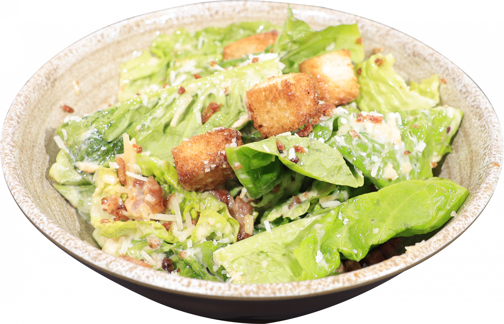 Baby gem lettuce + home-made Caesar dressing + shaved parmesan + croutons + crispy bacon pieces