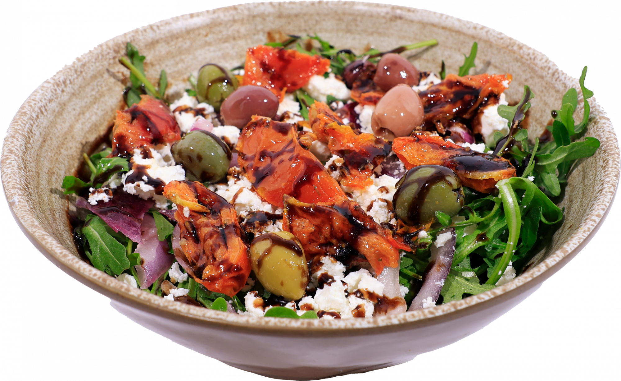 Greek salad + rocket + red onion + feta + sun blushed+ balsamic + marinated olives