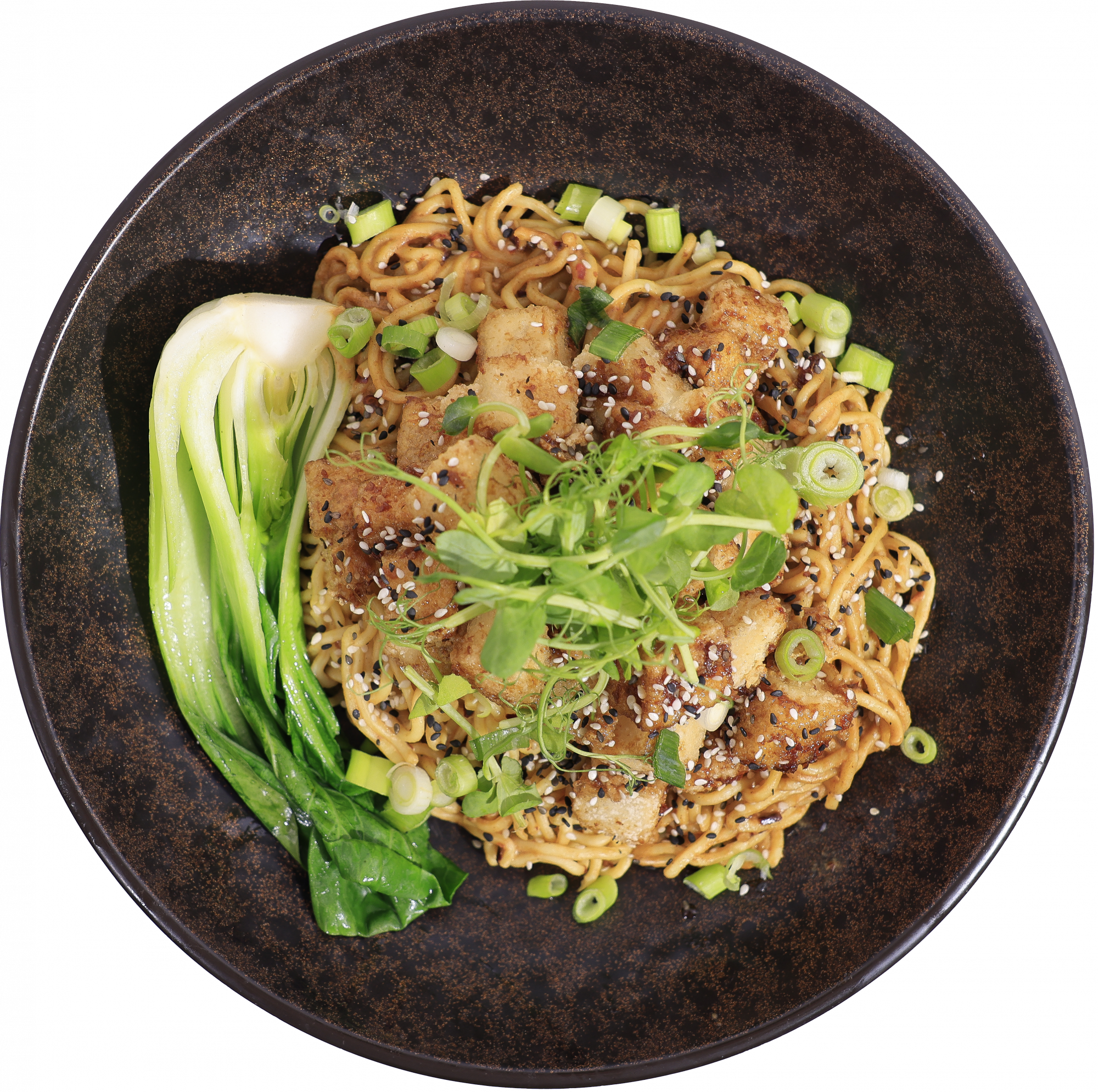 Crispy fried Tofu + Adobo style sauce + soba noodles + Pak Choi + spring onion + sesame seeds + Sichuan Chilli oil