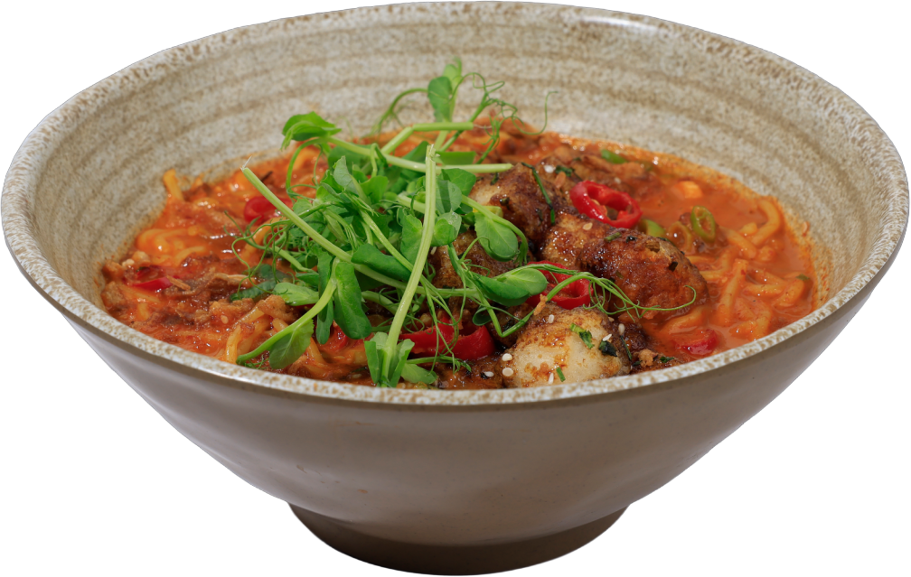 Japanese ramen + soba noodles + sesame seeds + spring onion + chilli oil + prawn dumplings + fresh chilli + pea shoots + coconut m... Read more